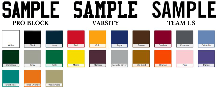 You select the font, size & color. The standard lead time for names & numbers is 5-7 working days. Team orders preferred.